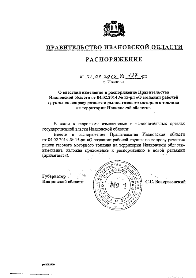 Распоряжение Правительства Ивановской области от 02.09.2019 N 137-рп "О внесении изменения в распоряжение Правительства Ивановской области от 04.02.2014 N 15-рп "О создании рабочей группы по вопросу развития рынка газового моторного топлива на территории Ивановской области"