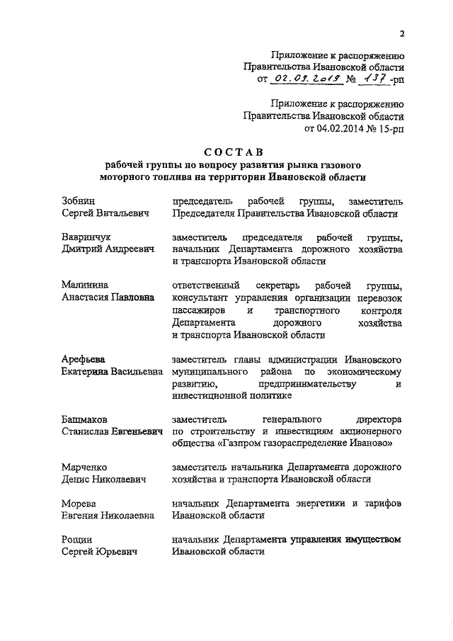 Распоряжение Правительства Ивановской области от 02.09.2019 N 137-рп "О внесении изменения в распоряжение Правительства Ивановской области от 04.02.2014 N 15-рп "О создании рабочей группы по вопросу развития рынка газового моторного топлива на территории Ивановской области"