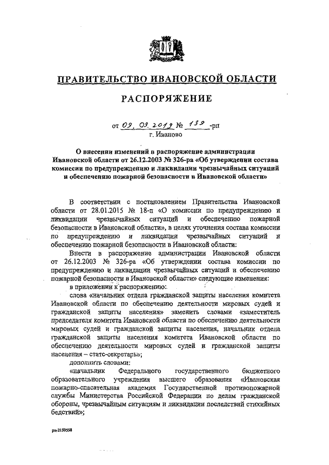 Распоряжение Правительства Ивановской области от 09.09.2019 N 139-рп "О внесении изменений в распоряжение администрации Ивановской области от 26.12.2003 N 326-ра "Об утверждении состава комиссии по предупреждению и ликвидации чрезвычайных ситуаций и обеспечению пожарной безопасности в Ивановской области"