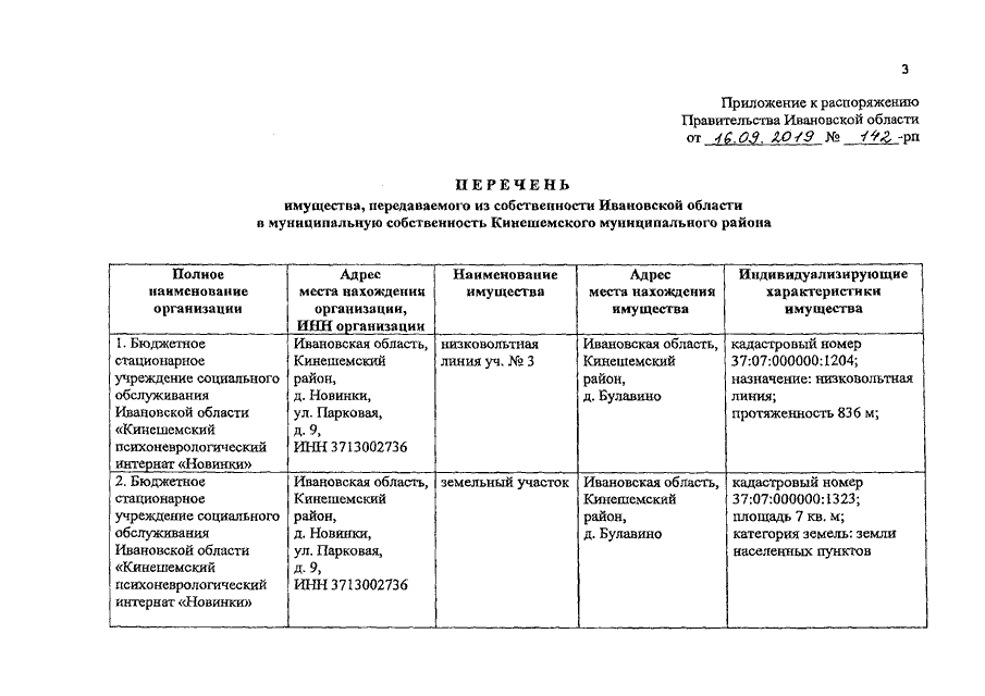 Распоряжение Правительства Ивановской области от 16.09.2019 N 142-рп "О передаче имущества из собственности Ивановской области в муниципальную собственность Кинешемского муниципального района"