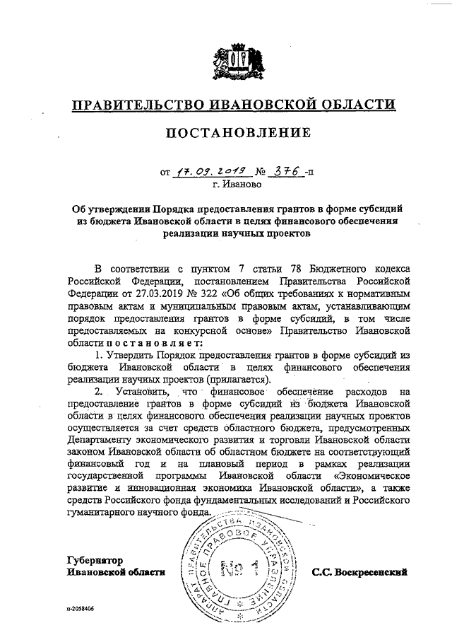 Постановление Правительства Ивановской области от 17.09.2019 N 376-п "Об утверждении Порядка предоставления грантов в форме субсидий из бюджета Ивановской области в целях финансового обеспечения реализации научных проектов"