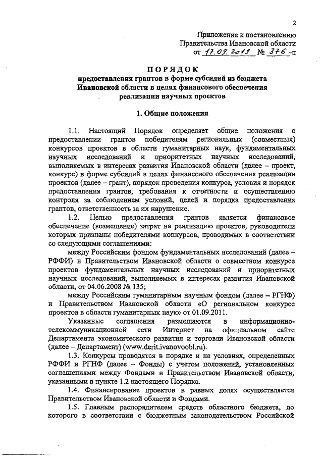 Постановление Правительства Ивановской области от 17.09.2019 N 376-п "Об утверждении Порядка предоставления грантов в форме субсидий из бюджета Ивановской области в целях финансового обеспечения реализации научных проектов"