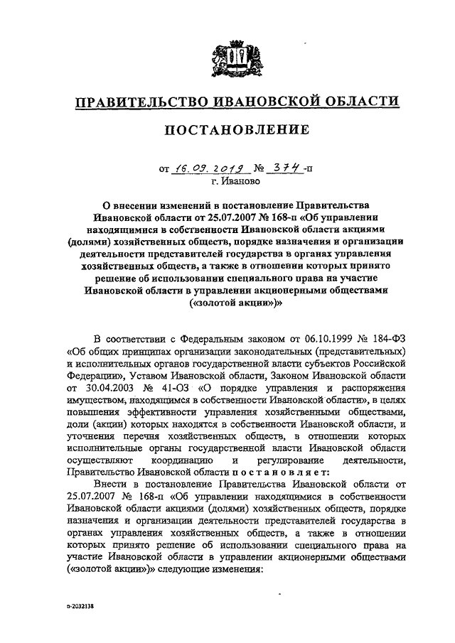 Постановление Правительства Ивановской области от 16.09.2019 N 374-п "О внесении изменений в постановление Правительства Ивановской области от 25.07.2007 N 168-п "Об управлении находящимися в собственности Ивановской области акциями (долями) хозяйственных обществ, порядке назначения и организации деятельности представителей государства в органах управления хозяйственных обществ, а также в отношении которых принято решение об использовании специального права на участие Ивановской области в управлении акционерными обществами ("золотой акции")" (вместе с "Перечнем хозяйственных обществ, в отношении которых исполнительные органы государственной власти Ивановской области осуществляют координацию и регулирование деятельности")
