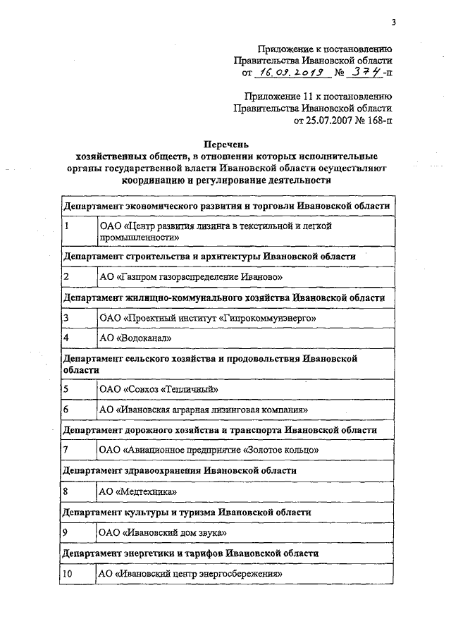Постановление Правительства Ивановской области от 16.09.2019 N 374-п "О внесении изменений в постановление Правительства Ивановской области от 25.07.2007 N 168-п "Об управлении находящимися в собственности Ивановской области акциями (долями) хозяйственных обществ, порядке назначения и организации деятельности представителей государства в органах управления хозяйственных обществ, а также в отношении которых принято решение об использовании специального права на участие Ивановской области в управлении акционерными обществами ("золотой акции")" (вместе с "Перечнем хозяйственных обществ, в отношении которых исполнительные органы государственной власти Ивановской области осуществляют координацию и регулирование деятельности")
