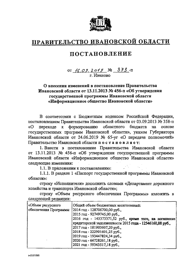 Постановление Правительства Ивановской области от 16.09.2019 N 373-п "О внесении изменений в постановление Правительства Ивановской области от 13.11.2013 N 456-п "Об утверждении государственной программы Ивановской области "Информационное общество Ивановской области"