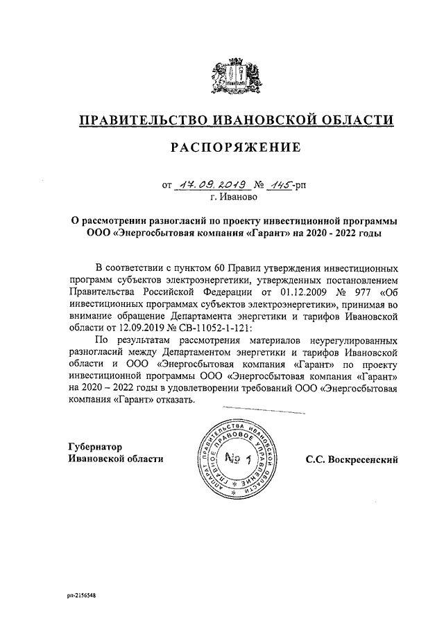 Распоряжение Правительства Ивановской области от 17.09.2019 N 145-рп "О рассмотрении разногласий по проекту инвестиционной программы ООО "Энергосбытовая компания "Гарант" на 2020 - 2022 годы"