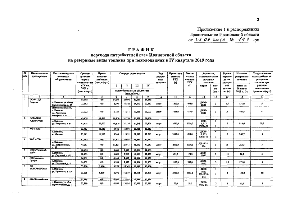 Распоряжение Правительства Ивановской области от 23.09.2019 N 147-рп "Об утверждении графиков перевода потребителей газа Ивановской области на резервные виды топлива при похолоданиях в IV квартале 2019 года и ограничения снабжения газом покупателей Ивановской области и очередности их отключения в случае нарушения технологического режима работы газотранспортной системы при аварии в IV квартале 2019 года"