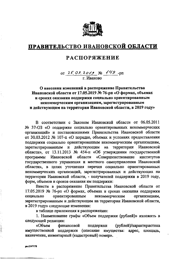 Распоряжение Правительства Ивановской области от 25.09.2019 N 149-рп "О внесении изменений в распоряжение Правительства Ивановской области от 17.05.2019 N 76-рп "О формах, объемах и сроках оказания поддержки социально ориентированным некоммерческим организациям, зарегистрированным и действующим на территории Ивановской области, в 2019 году"