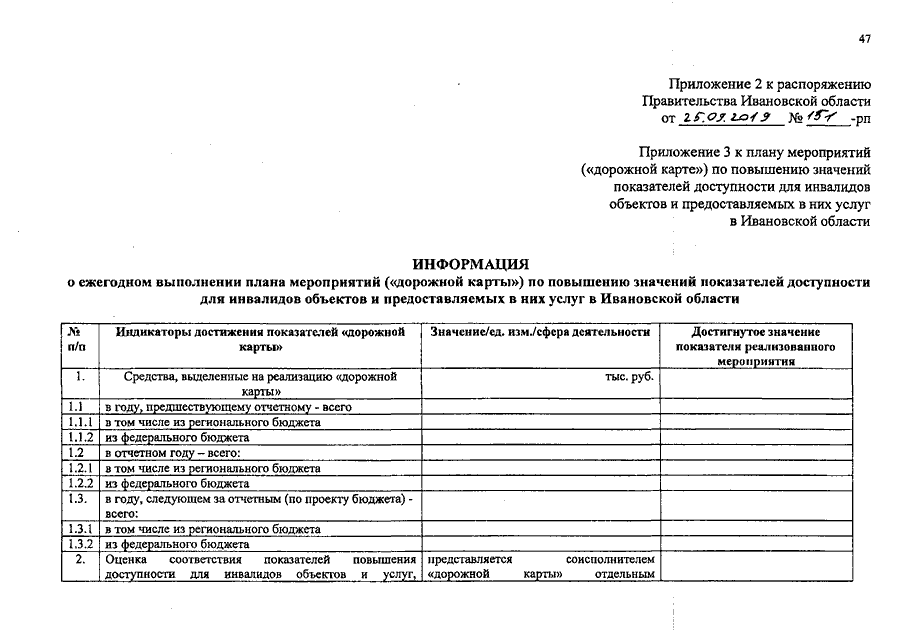 Распоряжение Правительства Ивановской области от 25.09.2019 N 151-рп "О внесении изменений в распоряжение Правительства Ивановской области от 17.12.2015 N 286-рп "Об утверждении плана мероприятий ("дорожной карты") по повышению значений показателей доступности для инвалидов объектов и предоставляемых в них услуг в Ивановской области"