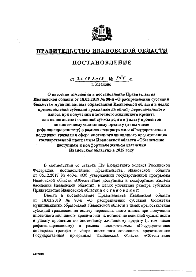 Постановление Правительства Ивановской области от 23.09.2019 N 381-п "О внесении изменения в постановление Правительства Ивановской области от 18.03.2019 N 80-п "О распределении субсидий бюджетам муниципальных образований Ивановской области в целях предоставления субсидий гражданам на оплату первоначального взноса при получении ипотечного жилищного кредита или на погашение основной суммы долга и уплату процентов по ипотечному жилищному кредиту (в том числе рефинансированному) в рамках подпрограммы "Государственная поддержка граждан в сфере ипотечного жилищного кредитования" государственной программы Ивановской области "Обеспечение доступным и комфортным жильем населения Ивановской области" в 2019 году"