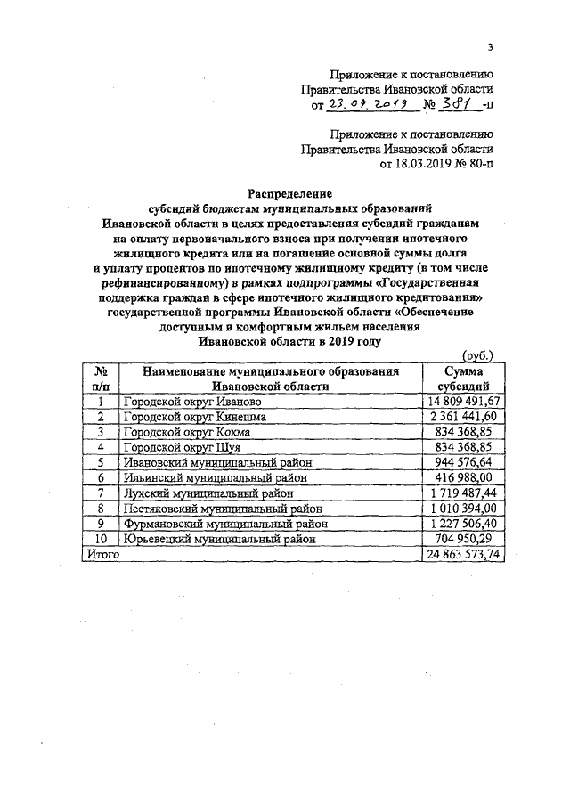 Постановление Правительства Ивановской области от 23.09.2019 N 381-п "О внесении изменения в постановление Правительства Ивановской области от 18.03.2019 N 80-п "О распределении субсидий бюджетам муниципальных образований Ивановской области в целях предоставления субсидий гражданам на оплату первоначального взноса при получении ипотечного жилищного кредита или на погашение основной суммы долга и уплату процентов по ипотечному жилищному кредиту (в том числе рефинансированному) в рамках подпрограммы "Государственная поддержка граждан в сфере ипотечного жилищного кредитования" государственной программы Ивановской области "Обеспечение доступным и комфортным жильем населения Ивановской области" в 2019 году"