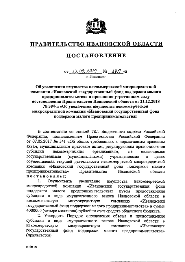 Постановление Правительства Ивановской области от 23.09.2019 N 379-п "Об увеличении имущества некоммерческой микрокредитной компании "Ивановский государственный фонд поддержки малого предпринимательства" и признании утратившим силу постановления Правительства Ивановской области от 21.12.2018 N 384-п "Об увеличении имущества некоммерческой микрокредитной компании "Ивановский государственный фонд поддержки малого предпринимательства" (вместе с "Порядком определения объема и предоставления субсидии в виде имущественного взноса Ивановской области в некоммерческую микрокредитную компанию "Ивановский государственный фонд поддержки малого предпринимательства")
