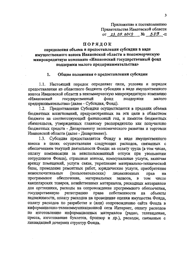 Постановление Правительства Ивановской области от 23.09.2019 N 379-п "Об увеличении имущества некоммерческой микрокредитной компании "Ивановский государственный фонд поддержки малого предпринимательства" и признании утратившим силу постановления Правительства Ивановской области от 21.12.2018 N 384-п "Об увеличении имущества некоммерческой микрокредитной компании "Ивановский государственный фонд поддержки малого предпринимательства" (вместе с "Порядком определения объема и предоставления субсидии в виде имущественного взноса Ивановской области в некоммерческую микрокредитную компанию "Ивановский государственный фонд поддержки малого предпринимательства")