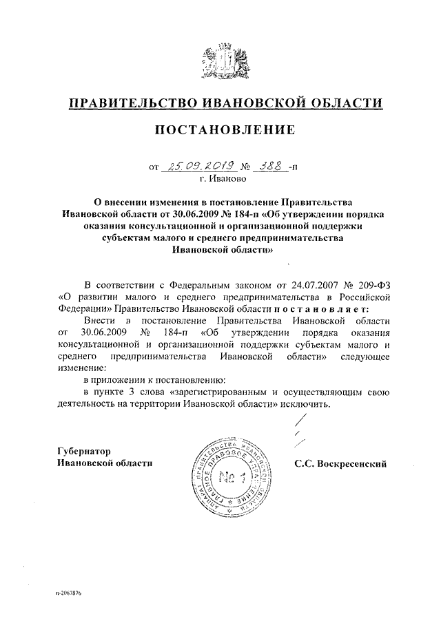 Постановление Правительства Ивановской области от 25.09.2019 N 388-п "О внесении изменения в постановление Правительства Ивановской области от 30.06.2009 N 184-п "Об утверждении Порядка оказания консультационной и организационной поддержки субъектам малого и среднего предпринимательства Ивановской области"