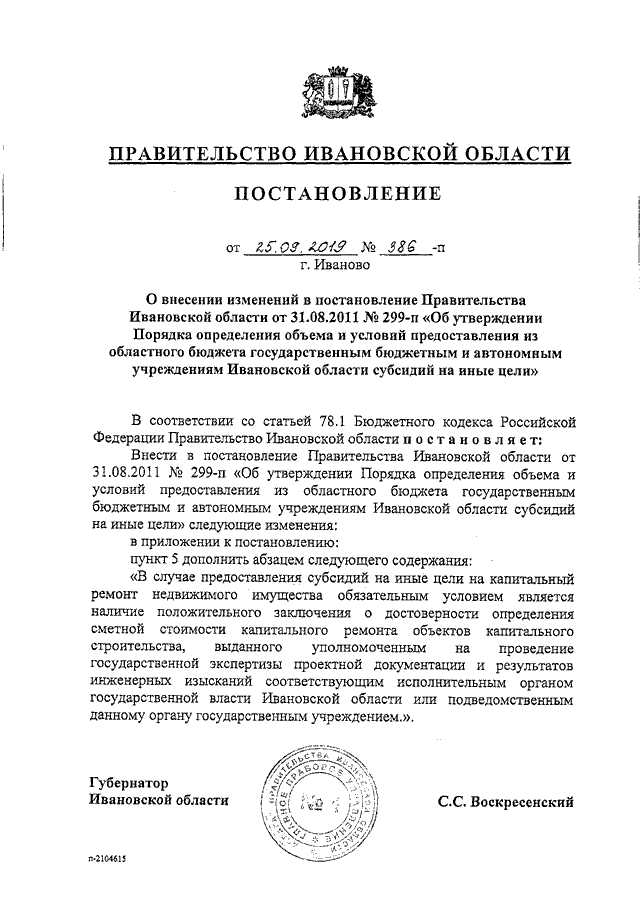 Постановление Правительства Ивановской области от 25.09.2019 N 386-п "О внесении изменений в постановление Правительства Ивановской области от 31.08.2011 N 299-п "Об утверждении Порядка определения объема и условий предоставления из областного бюджета государственным бюджетным и автономным учреждениям Ивановской области субсидий на иные цели"