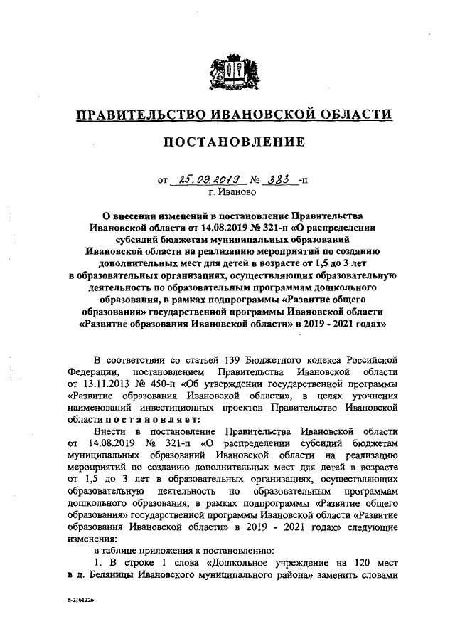 Постановление Правительства Ивановской области от 25.09.2019 N 383-п "О внесении изменений в постановление Правительства Ивановской области от 14.08.2019 N 321-п "О распределении субсидий бюджетам муниципальных образований Ивановской области на реализацию мероприятий по созданию дополнительных мест для детей в возрасте от 1,5 до 3 лет в образовательных организациях, осуществляющих образовательную деятельность по образовательным программам дошкольного образования, в рамках подпрограммы "Развитие общего образования" государственной программы Ивановской области "Развитие образования Ивановской области" в 2019 - 2021 годах"