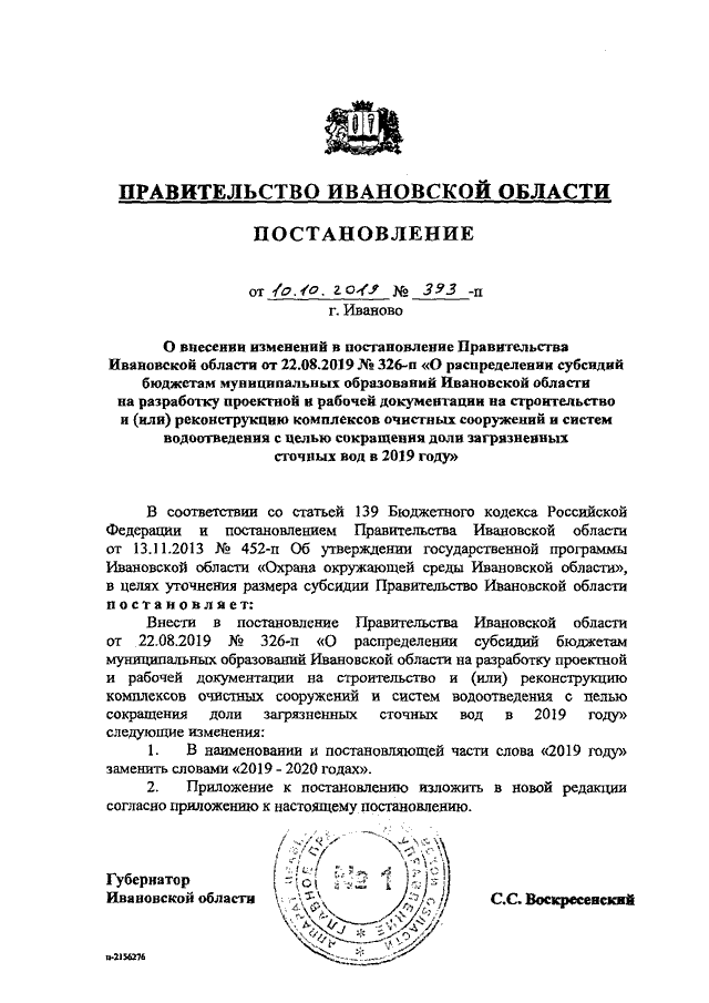 Постановление Правительства Ивановской области от 10.10.2019 N 393-п "О внесении изменений в постановление Правительства Ивановской области от 22.08.2019 N 326-п "О распределении субсидий бюджетам муниципальных образований Ивановской области на разработку проектной и рабочей документации на строительство и (или) реконструкцию комплексов очистных сооружений и систем водоотведения с целью сокращения доли загрязненных сточных вод в 2019 году"