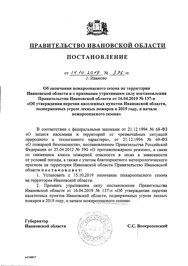 Постановление Правительства Ивановской области от 14.10.2019 N 396-п "Об окончании пожароопасного сезона на территории Ивановской области и о признании утратившим силу постановления Правительства Ивановской области от 16.04.2019 N 137-п "Об утверждении перечня населенных пунктов Ивановской области, подверженных угрозе лесных пожаров в 2019 году, и начале пожароопасного сезона"