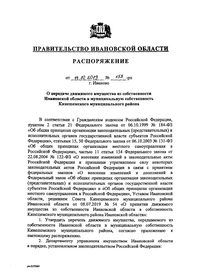 Распоряжение Правительства Ивановской области от 14.10.2019 N 157-рп "О передаче движимого имущества из собственности Ивановской области в муниципальную собственность Кинешемского муниципального района"