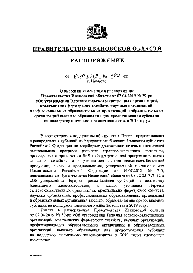 Распоряжение Правительства Ивановской области от 14.10.2019 N 160-рп "О внесении изменения в распоряжение Правительства Ивановской области от 02.04.2019 N 39-рп "Об утверждении Перечня сельскохозяйственных организаций, крестьянских фермерских хозяйств, научных организаций, профессиональных образовательных организаций и образовательных организаций высшего образования для предоставления субсидии на поддержку племенного животноводства в 2019 году"