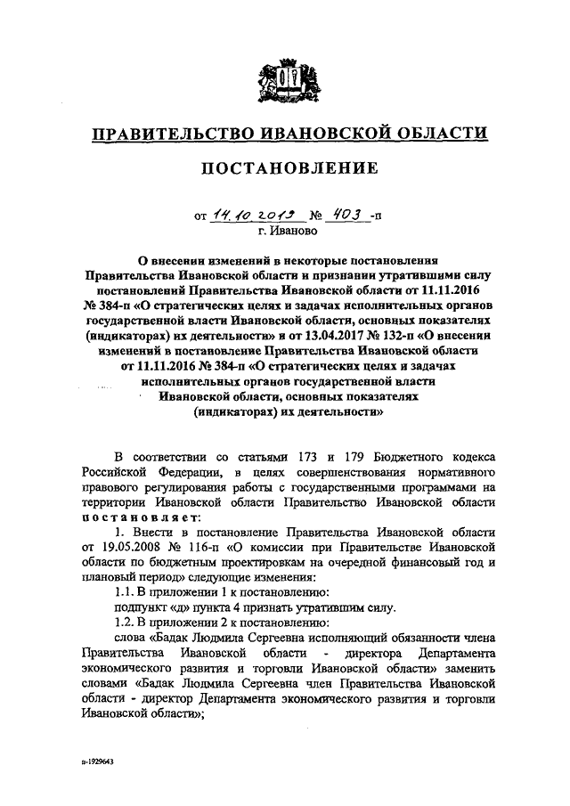 Постановление Правительства Ивановской области от 14.10.2019 N 403-п "О внесении изменений в некоторые постановления Правительства Ивановской области и признании утратившими силу постановлений Правительства Ивановской области от 11.11.2016 N 384-п "О стратегических целях и задачах исполнительных органов государственной власти Ивановской области, основных показателях (индикаторах) их деятельности" и от 13.04.2017 N 132-п "О внесении изменений в постановление Правительства Ивановской области от 11.11.2016 N 384-п "О стратегических целях и задачах исполнительных органов государственной власти Ивановской области, основных показателях (индикаторах) их деятельности" (вместе с "Перечнем исполнительных органов государственной власти Ивановской области, ответственных за работу с государственными программами Российской Федерации")