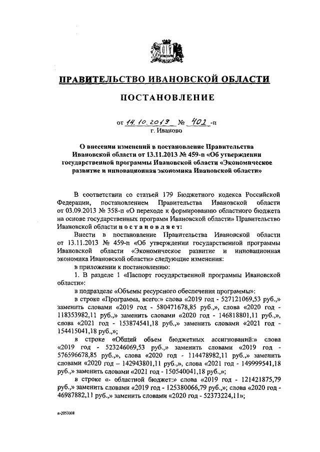 Постановление Правительства Ивановской области от 14.10.2019 N 402-п "О внесении изменений в постановление Правительства Ивановской области от 13.11.2013 N 459-п "Об утверждении государственной программы Ивановской области "Экономическое развитие и инновационная экономика Ивановской области" (вместе с "Порядком предоставления целевых грантов начинающим субъектам малого предпринимательства на создание собственного дела")
