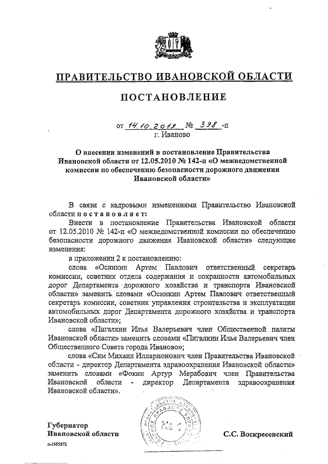 Постановление Правительства Ивановской области от 14.10.2019 N 398-п "О внесении изменений в постановление Правительства Ивановской области от 12.05.2010 N 142-п "О межведомственной комиссии по обеспечению безопасности дорожного движения Ивановской области"