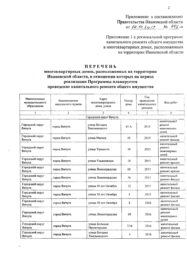 Постановление Правительства Ивановской области от 14.10.2019 N 406-п "О внесении изменения в постановление Правительства Ивановской области от 30.04.2014 N 164-п "Об утверждении региональной программы капитального ремонта общего имущества в многоквартирных домах, расположенных на территории Ивановской области" (вместе с "Перечнем многоквартирных домов, расположенных на территории Ивановской области, в отношении которых на период реализации программы планируется проведение капитального ремонта общего имущества")