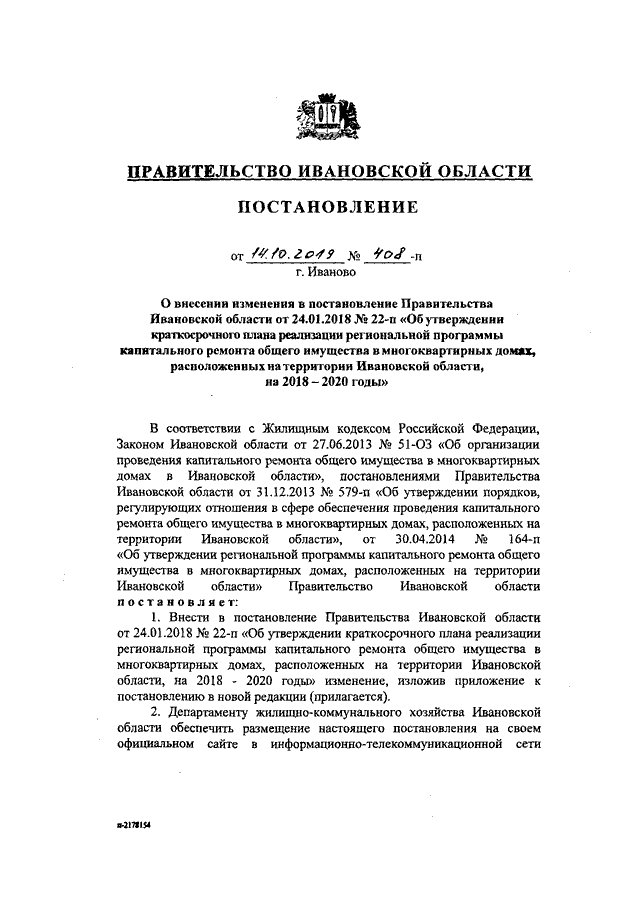 Постановление Правительства Ивановской области от 14.10.2019 N 408-п "О внесении изменения в постановление Правительства Ивановской области от 24.01.2018 N 22-п "Об утверждении краткосрочного плана реализации региональной программы капитального ремонта общего имущества в многоквартирных домах, расположенных на территории Ивановской области, на 2018 - 2020 годы"