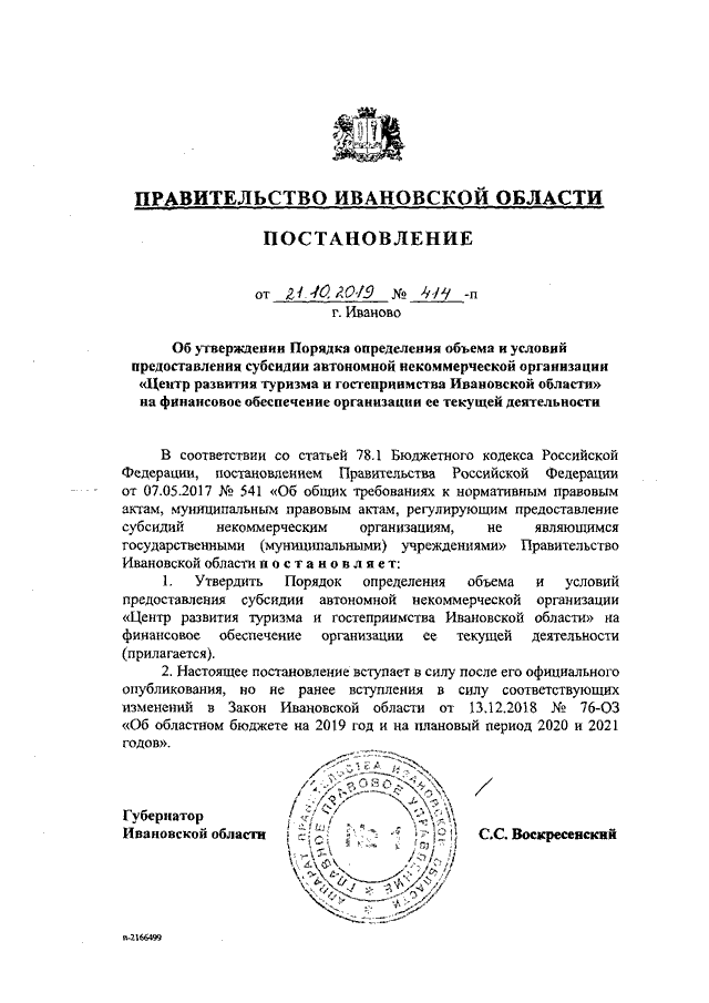 Постановление Правительства Ивановской области от 21.10.2019 N 414-п "Об утверждении Порядка определения объема и условий предоставления субсидии автономной некоммерческой организации "Центр развития туризма и гостеприимства Ивановской области" на финансовое обеспечение организации ее текущей деятельности"