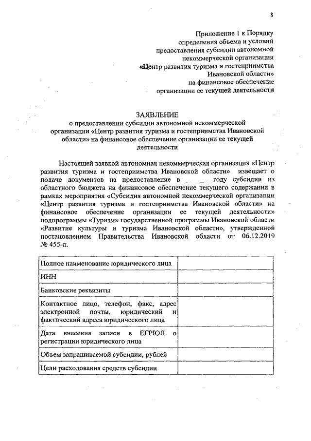 Постановление Правительства Ивановской области от 21.10.2019 N 414-п "Об утверждении Порядка определения объема и условий предоставления субсидии автономной некоммерческой организации "Центр развития туризма и гостеприимства Ивановской области" на финансовое обеспечение организации ее текущей деятельности"