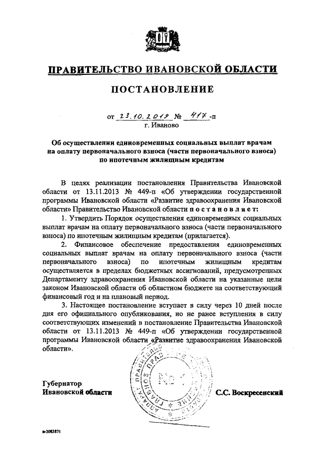 Постановление Правительства Ивановской области от 23.10.2019 N 417-п "Об осуществлении единовременных социальных выплат врачам на оплату первоначального взноса (части первоначального взноса) по ипотечным жилищным кредитам" (вместе с "Порядком осуществления единовременных социальных выплат врачам на оплату первоначального взноса (части первоначального взноса) по ипотечным жилищным кредитам")