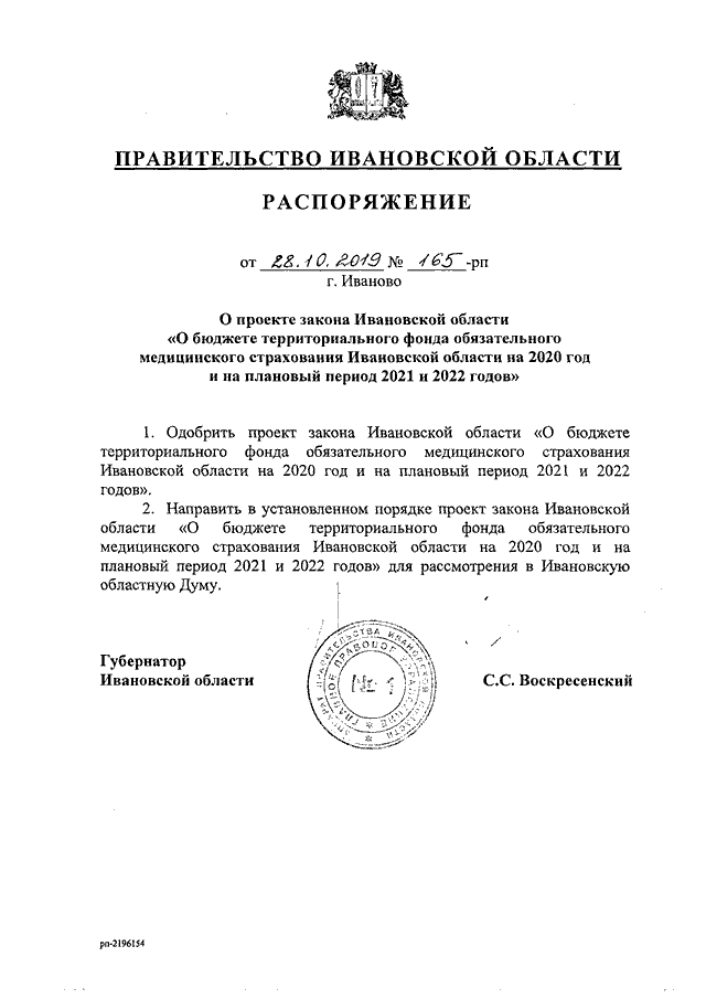 Распоряжение Правительства Ивановской области от 28.10.2019 N 165-рп "О проекте закона Ивановской области "О бюджете территориального фонда обязательного медицинского страхования Ивановской области на 2020 год и на плановый период 2021 и 2022 годов"