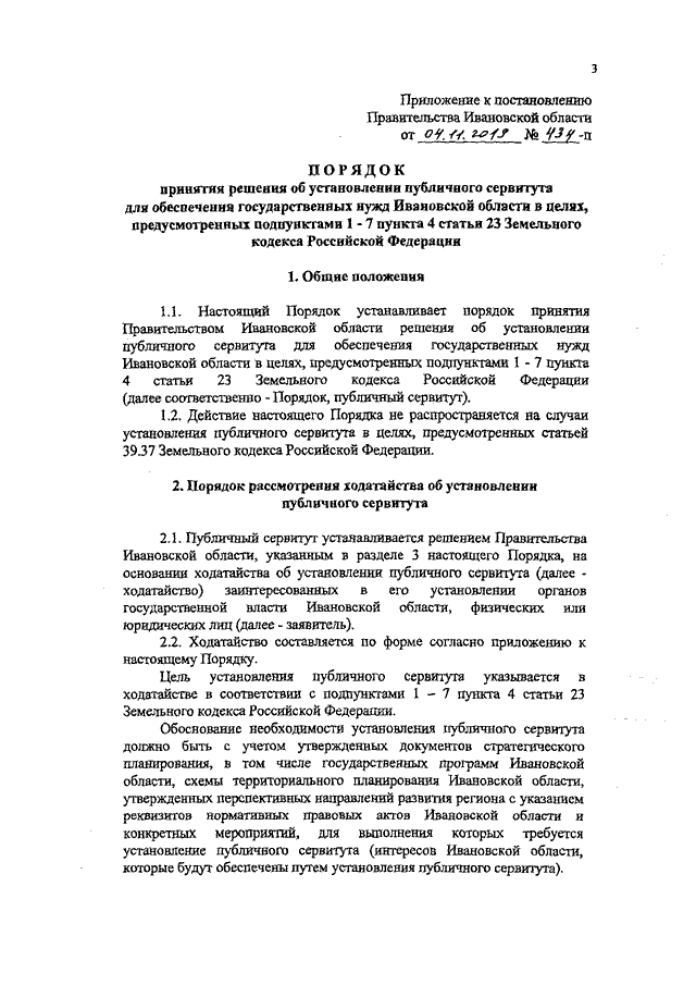 Постановление Правительства Ивановской области от 04.11.2019 N 434-п "Об утверждении Порядка принятия решения об установлении публичного сервитута для обеспечения государственных нужд Ивановской области в целях, предусмотренных подпунктами 1 - 7 пункта 4 статьи 23 Земельного кодекса Российской Федерации"