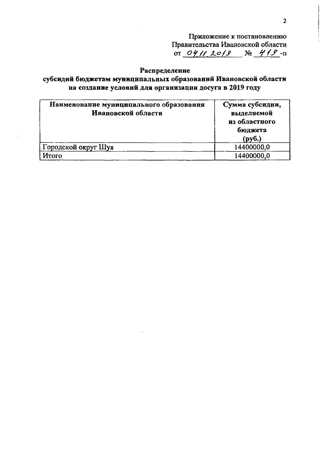 Постановление Правительства Ивановской области от 04.11.2019 N 419-п "О распределении субсидий бюджетам муниципальных образований Ивановской области на создание условий для организации досуга в 2019 году"