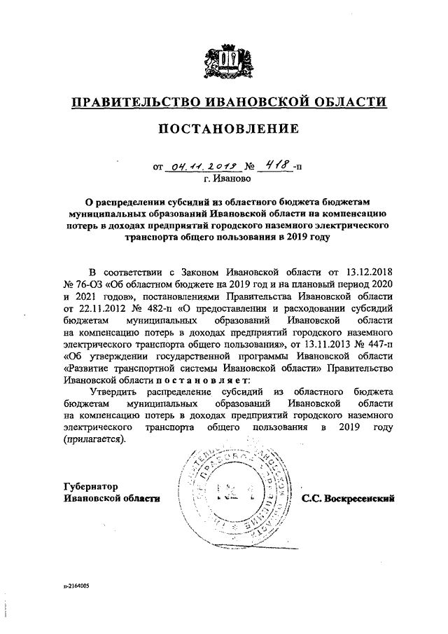 Постановление Правительства Ивановской области от 04.11.2019 N 418-п "О распределении субсидий из областного бюджета бюджетам муниципальных образований Ивановской области на компенсацию потерь в доходах предприятий городского наземного электрического транспорта общего пользования в 2019 году"