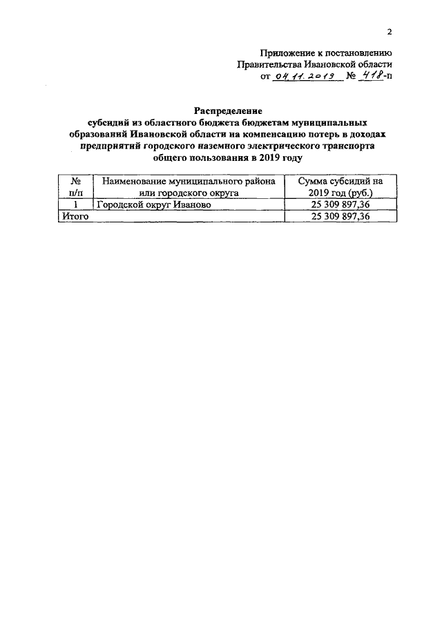 Постановление Правительства Ивановской области от 04.11.2019 N 418-п "О распределении субсидий из областного бюджета бюджетам муниципальных образований Ивановской области на компенсацию потерь в доходах предприятий городского наземного электрического транспорта общего пользования в 2019 году"