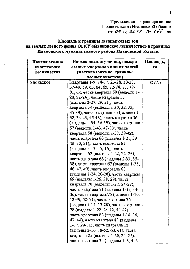 Распоряжение Правительства Ивановской области от 04.11.2019 N 166-рп "Об установлении площадей и границ лесопарковых зон и зеленых зон на землях лесного фонда ОГКУ "Ивановское лесничество" в границах Ивановского муниципального района Ивановской области"