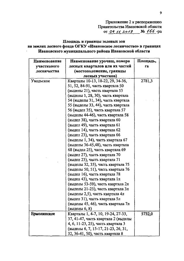 Распоряжение Правительства Ивановской области от 04.11.2019 N 166-рп "Об установлении площадей и границ лесопарковых зон и зеленых зон на землях лесного фонда ОГКУ "Ивановское лесничество" в границах Ивановского муниципального района Ивановской области"