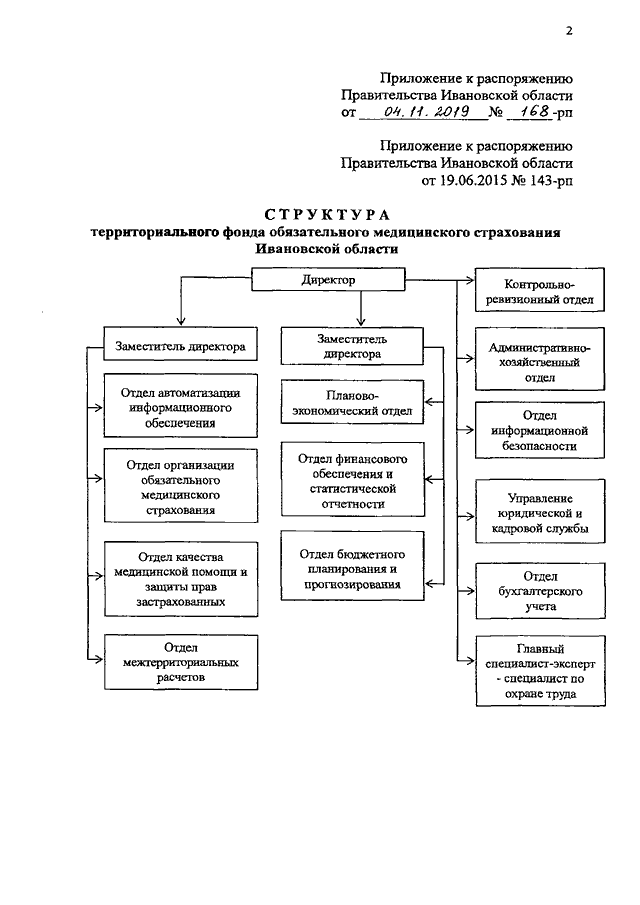 Распоряжение Правительства Ивановской области от 04.11.2019 N 168-рп "О внесении изменений в распоряжение Правительства Ивановской области от 19.06.2015 N 143-рп "Об утверждении структуры, предельной численности и фонда оплаты труда территориального фонда обязательного медицинского страхования Ивановской области"