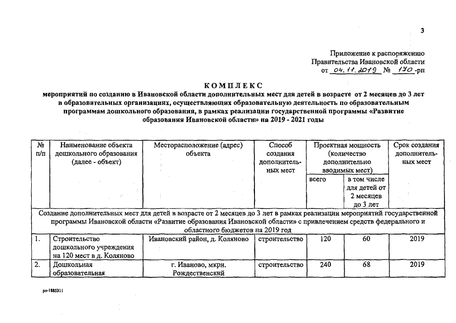 Распоряжение Правительства Ивановской области от 04.11.2019 N 170-рп "О внесении изменений в распоряжение Правительства Ивановской области от 19.07.2018 N 83-рп "Об утверждении комплекса мероприятий по созданию в Ивановской области дополнительных мест для детей в возрасте от 2 месяцев до 3 лет в образовательных организациях, осуществляющих образовательную деятельность по образовательным программам дошкольного образования, в рамках реализации государственной программы "Развитие образования Ивановской области" на 2019 - 2021 годы"