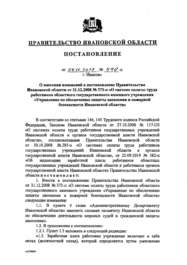 Постановление Правительства Ивановской области от 04.11.2019 N 440-п "О внесении изменений в постановление Правительства Ивановской области от 31.12.2008 N 373-п "О системе оплаты труда работников областного государственного казенного учреждения "Управление по обеспечению защиты населения и пожарной безопасности Ивановской области"