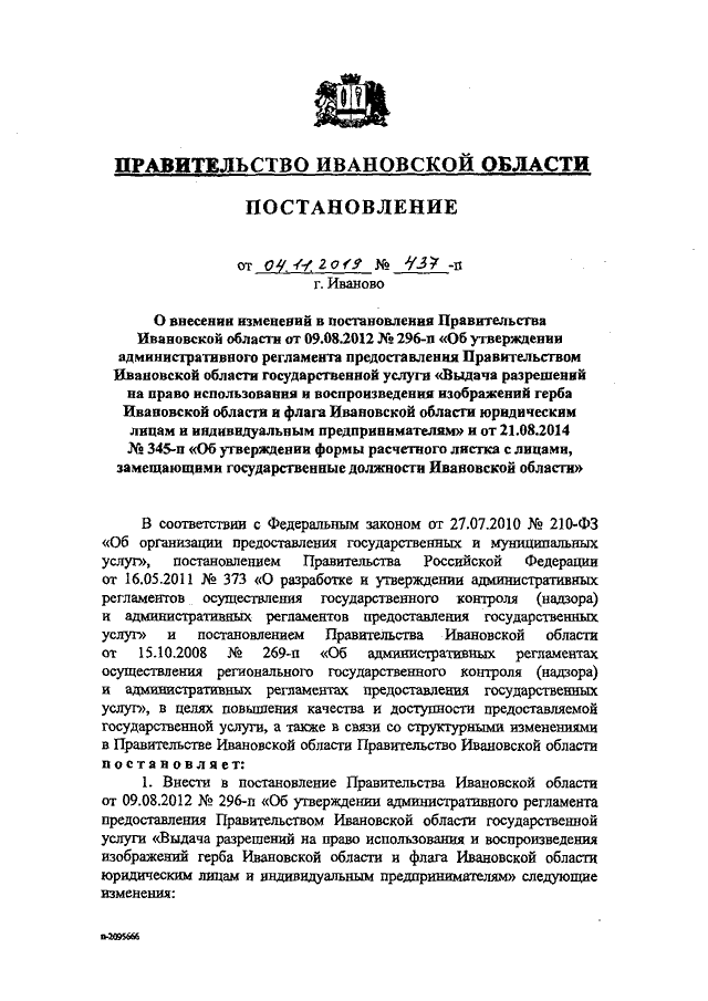 Постановление Правительства Ивановской области от 04.11.2019 N 437-п "О внесении изменений в постановления Правительства Ивановской области от 09.08.2012 N 296-п "Об утверждении административного регламента предоставления Правительством Ивановской области государственной услуги "Выдача разрешений на право использования и воспроизведения изображений герба Ивановской области и флага Ивановской области юридическим лицам и индивидуальным предпринимателям" и от 21.08.2014 N 345-п "Об утверждении формы расчетного листка с лицами, замещающими государственные должности Ивановской области"