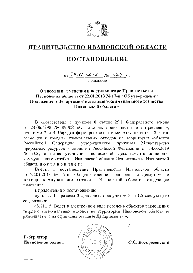 Постановление Правительства Ивановской области от 04.11.2019 N 433-п "О внесении изменения в постановление Правительства Ивановской области от 22.01.2013 N 17-п "Об утверждении Положения о Департаменте жилищно-коммунального хозяйства Ивановской области"