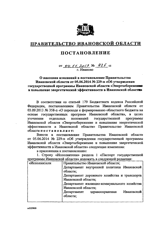 Постановление Правительства Ивановской области от 04.11.2019 N 425-п "О внесении изменений в постановление Правительства Ивановской области от 05.06.2014 N 229-п "Об утверждении государственной программы Ивановской области "Энергосбережение и повышение энергетической эффективности в Ивановской области"
