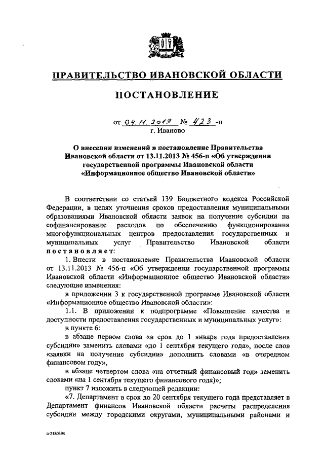 Постановление Правительства Ивановской области от 04.11.2019 N 423-п "О внесении изменений в постановление Правительства Ивановской области от 13.11.2013 N 456-п "Об утверждении государственной программы Ивановской области "Информационное общество Ивановской области"