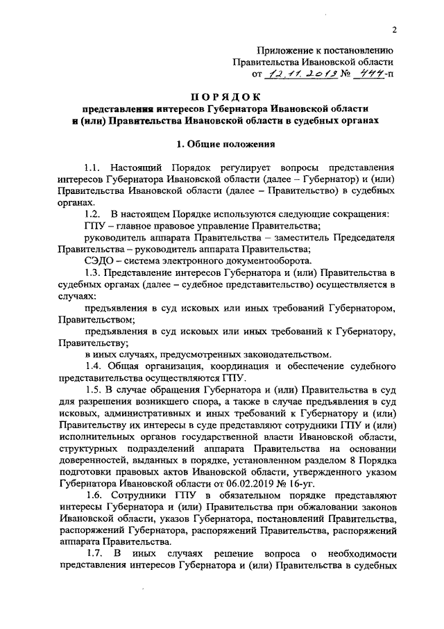 Постановление Правительства Ивановской области от 12.11.2019 N 444-п "Об утверждении Порядка представления интересов Губернатора Ивановской области и (или) Правительства Ивановской области в судебных органах"