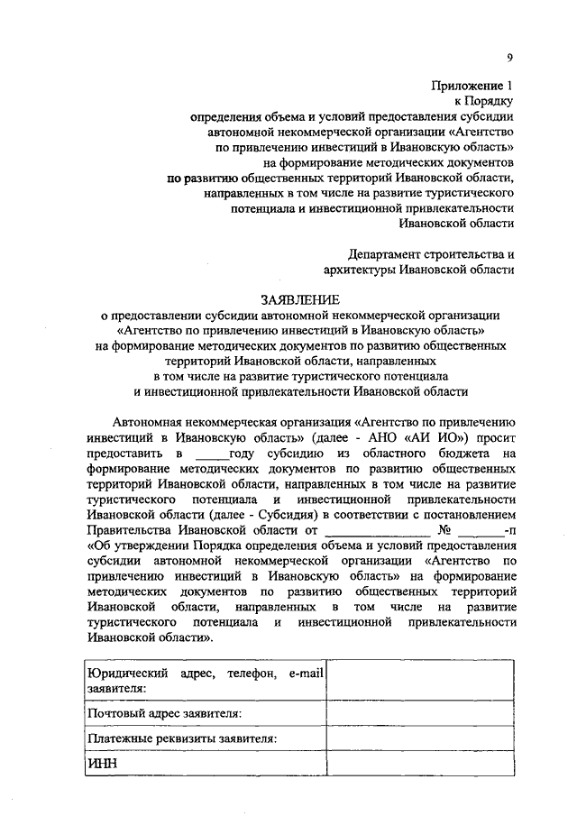 Постановление Правительства Ивановской области от 12.11.2019 N 443-п "Об утверждении Порядка определения объема и условий предоставления субсидии автономной некоммерческой организации "Агентство по привлечению инвестиций в Ивановскую область" на формирование методических документов по развитию общественных территорий Ивановской области, направленных в том числе на развитие туристического потенциала и инвестиционной привлекательности Ивановской области"