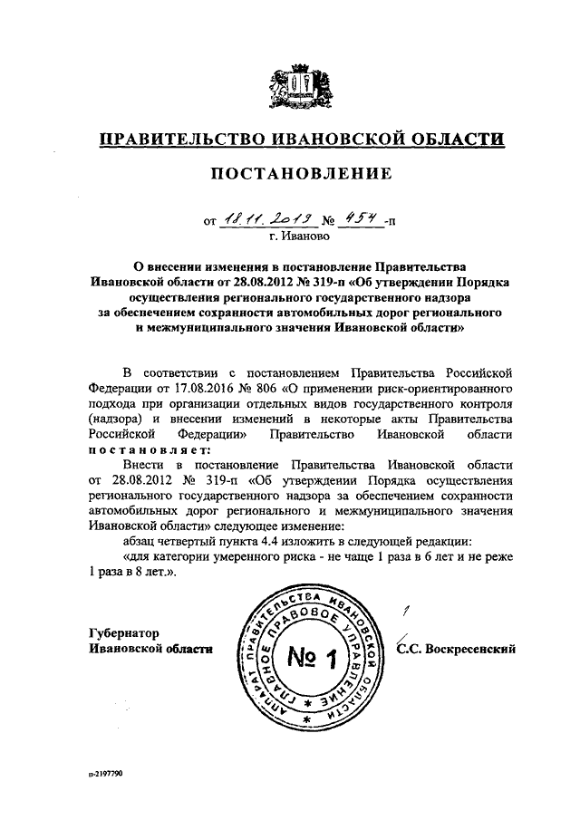 Постановление Правительства Ивановской области от 18.11.2019 N 454-п "О внесении изменения в постановление Правительства Ивановской области от 28.08.2012 N 319-п "Об утверждении Порядка осуществления регионального государственного надзора за обеспечением сохранности автомобильных дорог регионального и межмуниципального значения Ивановской области"