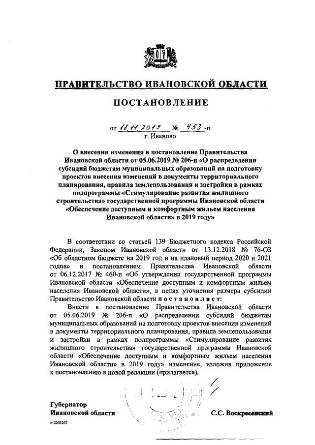 Постановление Правительства Ивановской области от 18.11.2019 N 453-п "О внесении изменения в постановление Правительства Ивановской области от 05.06.2019 N 206-п "О распределении субсидий бюджетам муниципальных образований на подготовку проектов внесения изменений в документы территориального планирования, правила землепользования и застройки в рамках подпрограммы "Стимулирование развития жилищного строительства" государственной программы Ивановской области "Обеспечение доступным и комфортным жильем населения Ивановской области" в 2019 году"